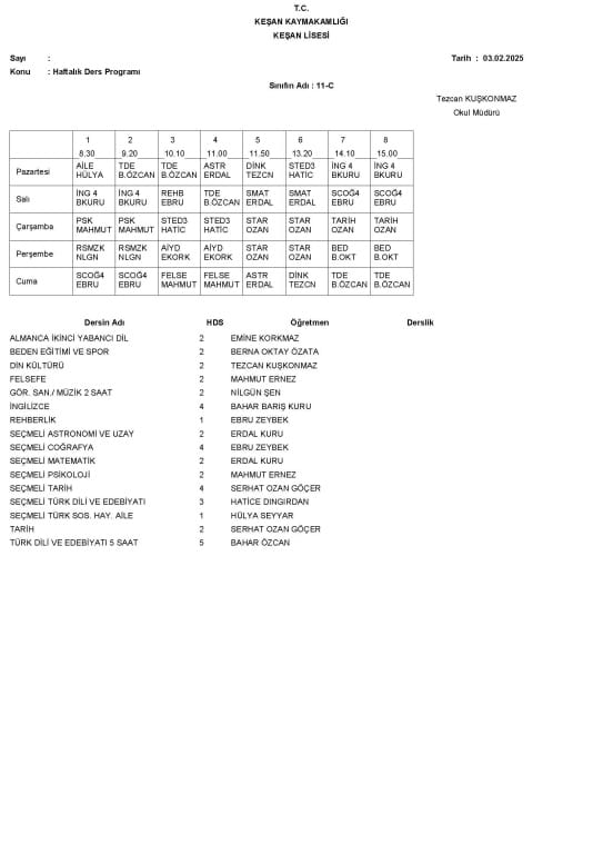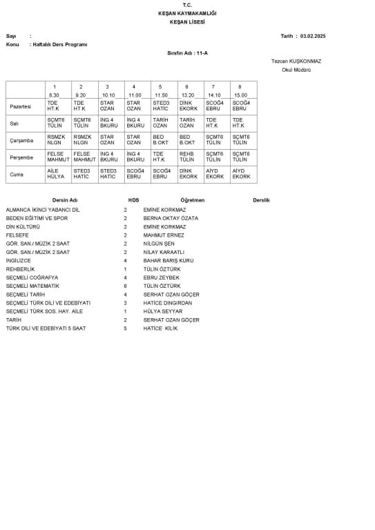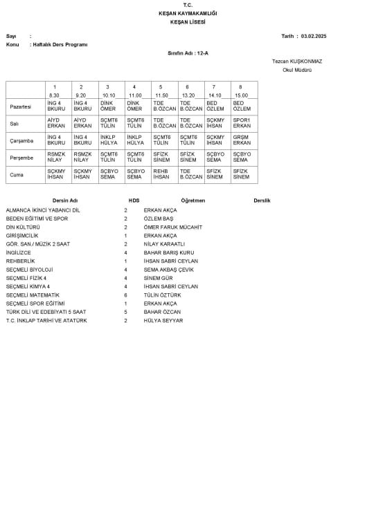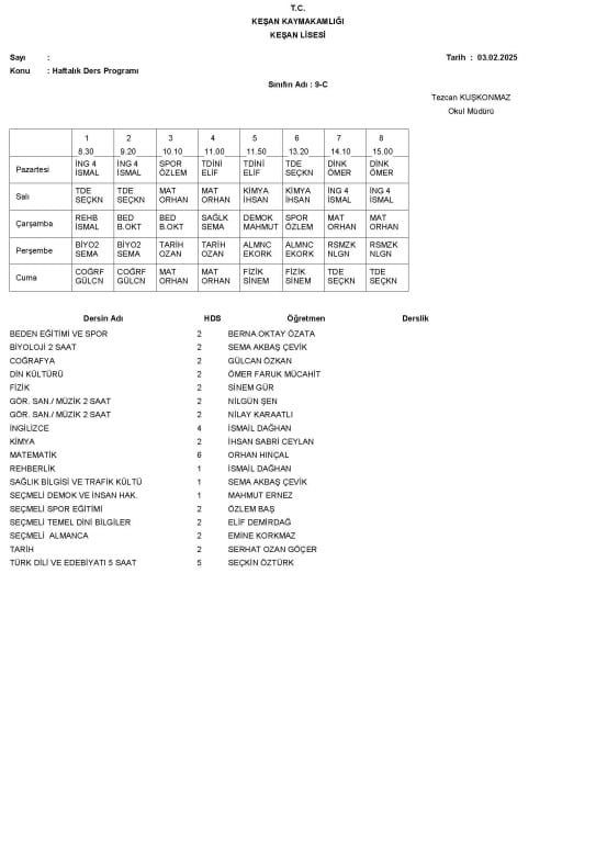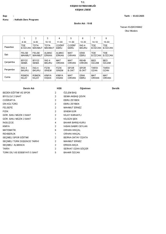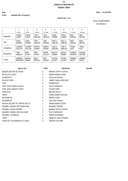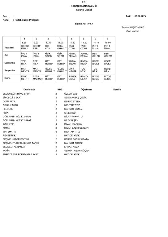 10 Mart 2025 Pazartesi Gününden İtibaren Uygulanacak Yeni Ders Programı aşağıdadır.