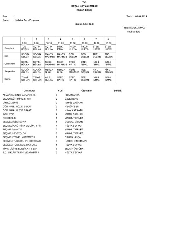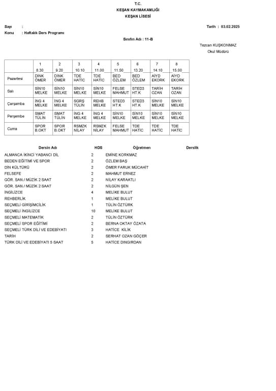 10 Mart 2025 Pazartesi Pazartesi Gününden İtibaren Uygulanacak Yeni Ders Programına ulaşmak için tıklayınız.