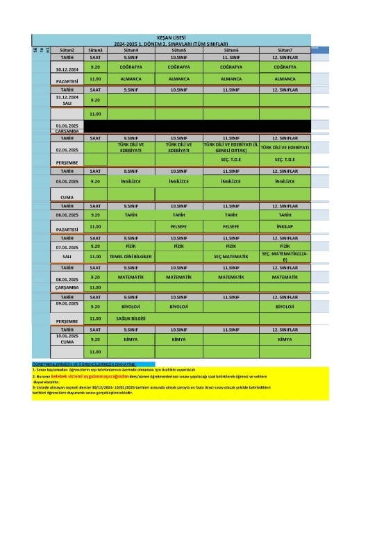 2024-2025 Eğitim-Öğretim Yılı, 1. Dönemde yapılacak olan 2. Sınav Programımız aşağıdaki gibidir. Sınavlar 30 Aralık 2024- 10 Ocak 2025 Tarihleri arasında yapılacaktır.