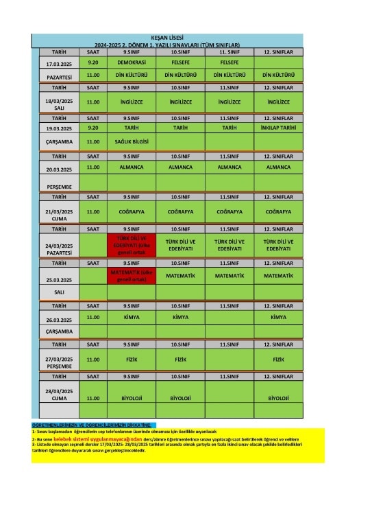 2024-2025 Eğitim-Öğretim Yılı, 2. Dönemde yapılacak olan 1. Sınav Programımız aşağıdaki gibidir.