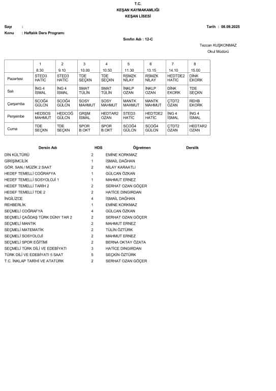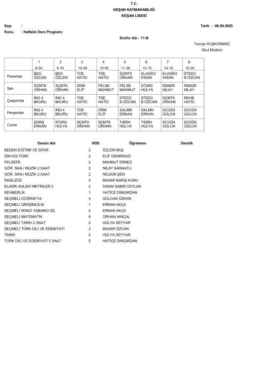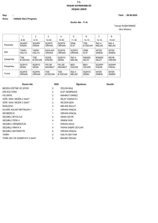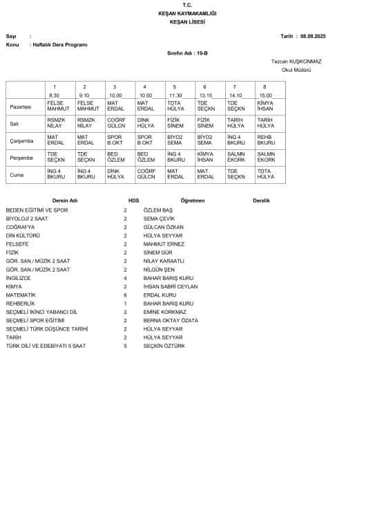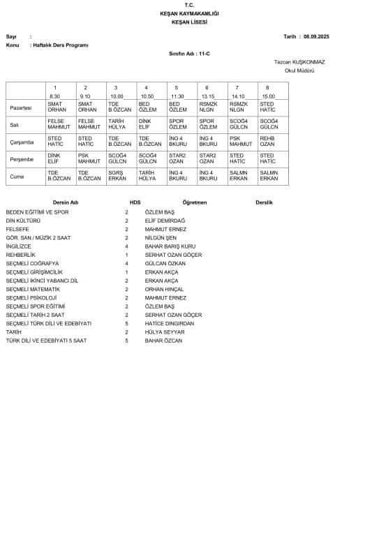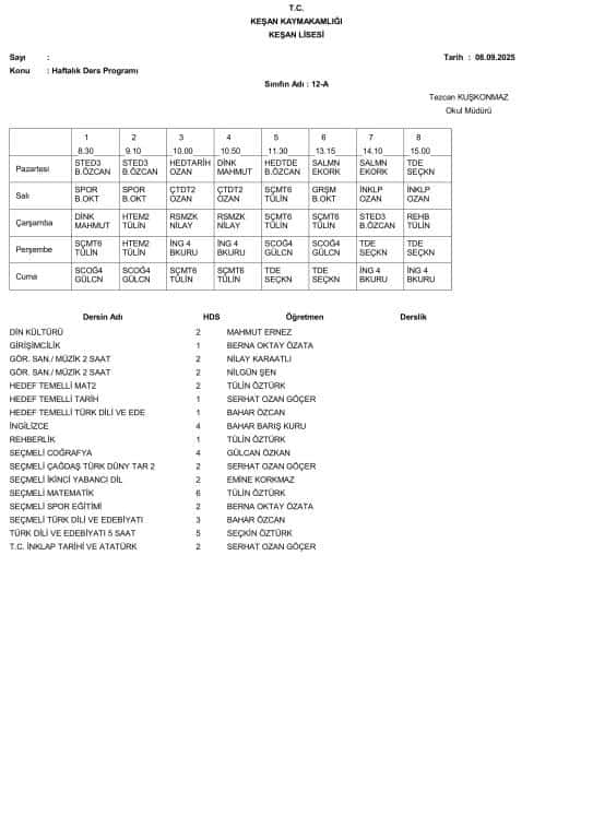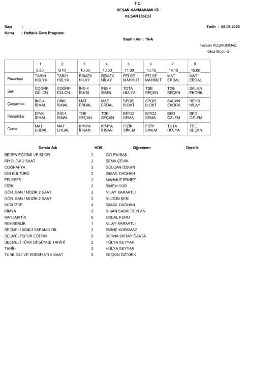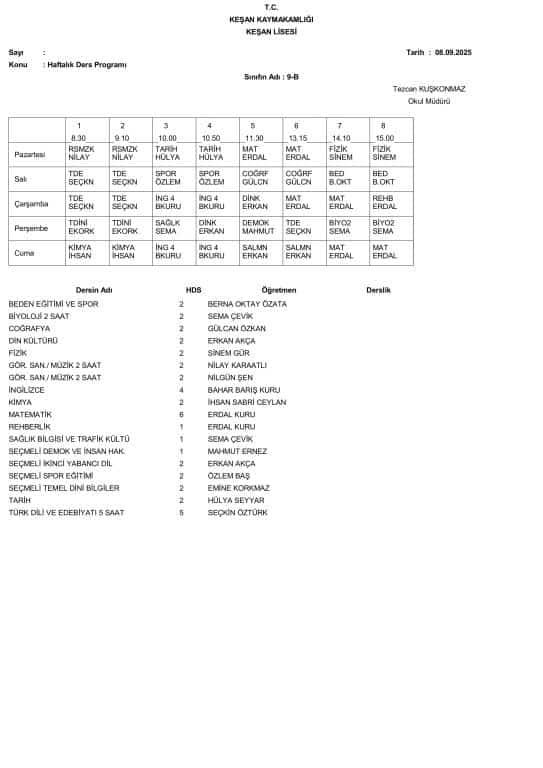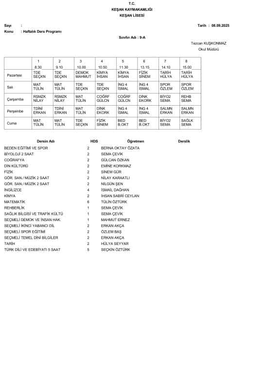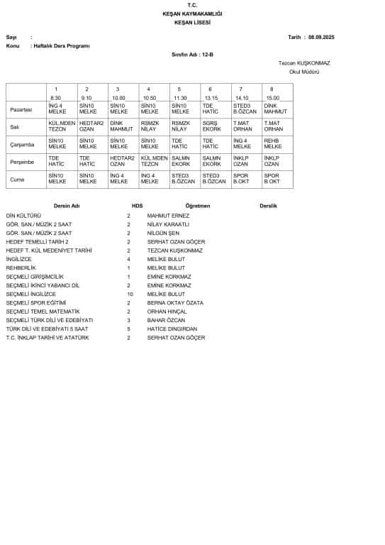 8 Eylül 2025 Pazartesi Gününden İtibaren Uygulanacak Ders Programı aşağıdadır. Öğrencilerimizin ders programını dikkate alarak Pazartesi günü okula gelmeleri önemle rica olunur.